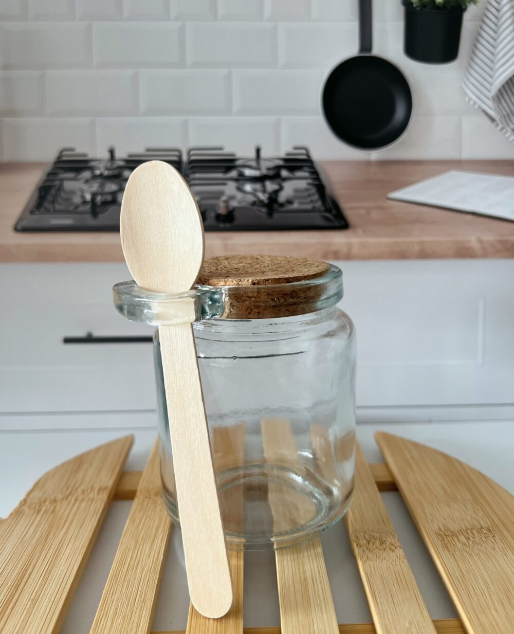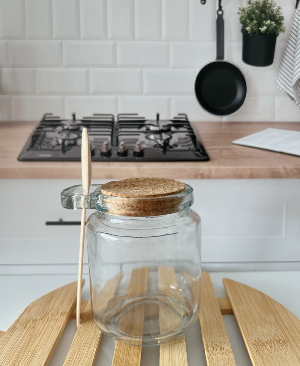 Frasco de vidrio con tapa de corcho y cuchara