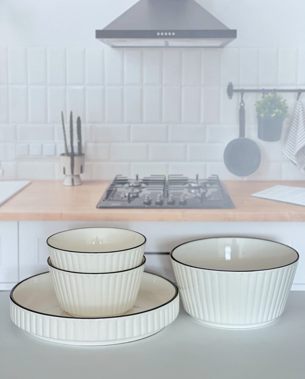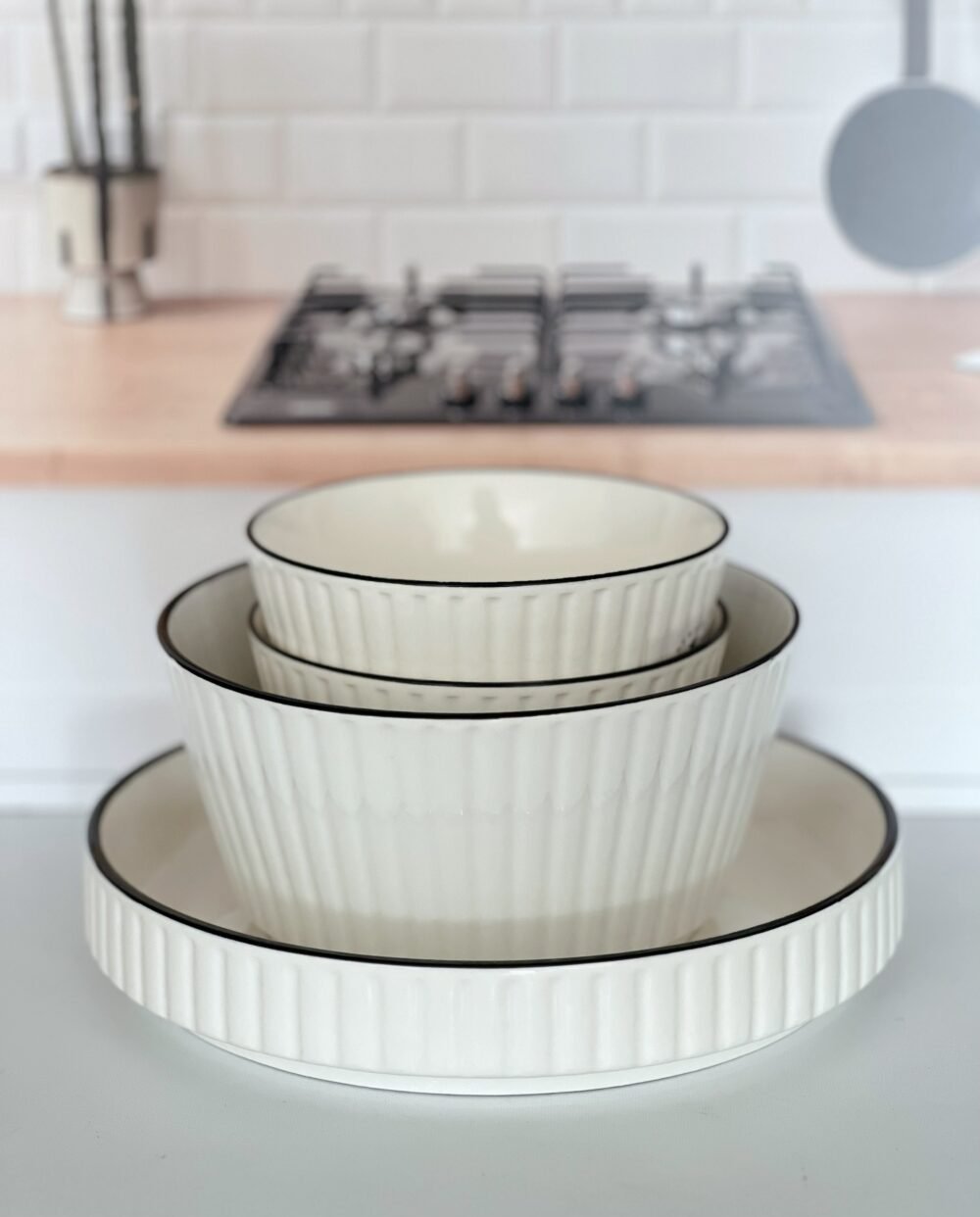 Este pack incluye 4 piezas de cerámica de color blanco con borde negro
