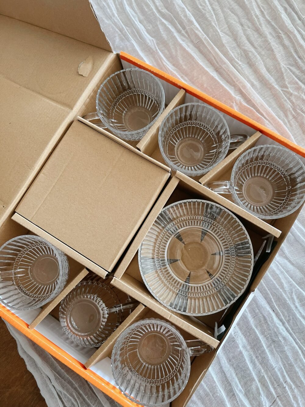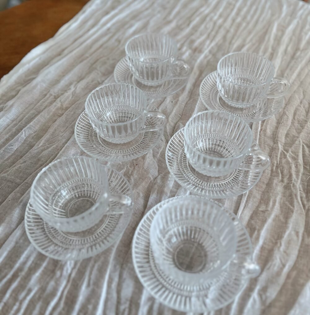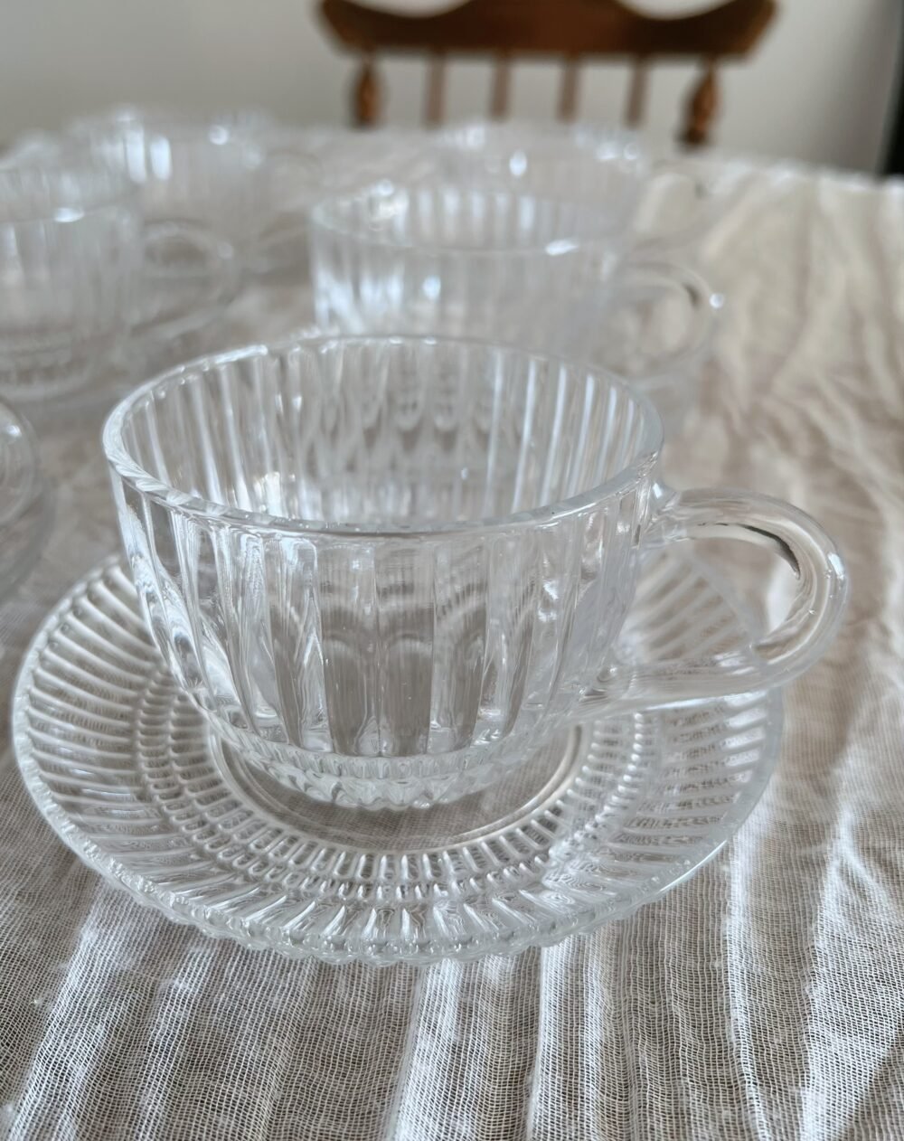 las tazas miden 6,7 cm por 9 cm y los platitos 14 cm de diámetro