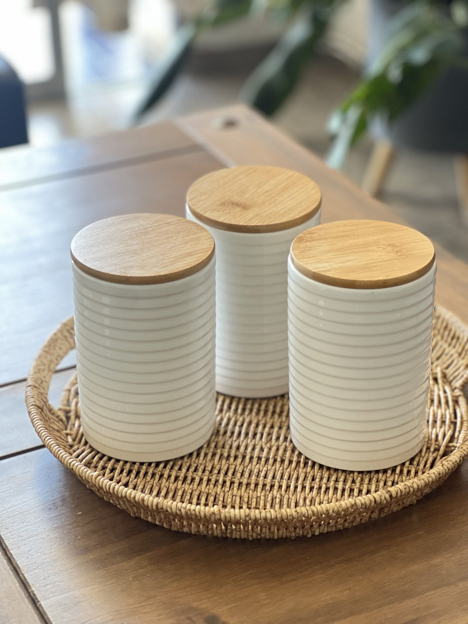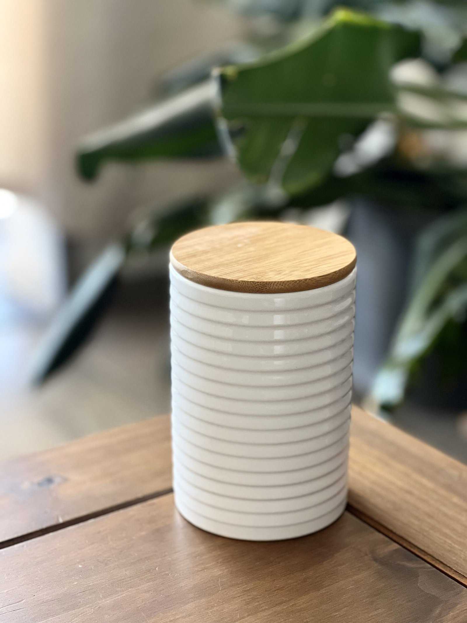 Recipiente multiuso de cerámica labrado con tapa de madera